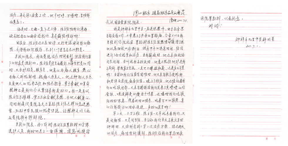 2011年7月5日,我院收到一封快递,这是由钟祥九里中学的一名退休老教师舒忠明寄来的感谢信和锦旗,信中表达了对本院胃肠科陈树清主任医术的肯定,更重要的是称赞陈主任的医德仁心和感谢国医堂医务人员对他的精心照料和关爱,字里行间,流露出浓浓的感激之情。